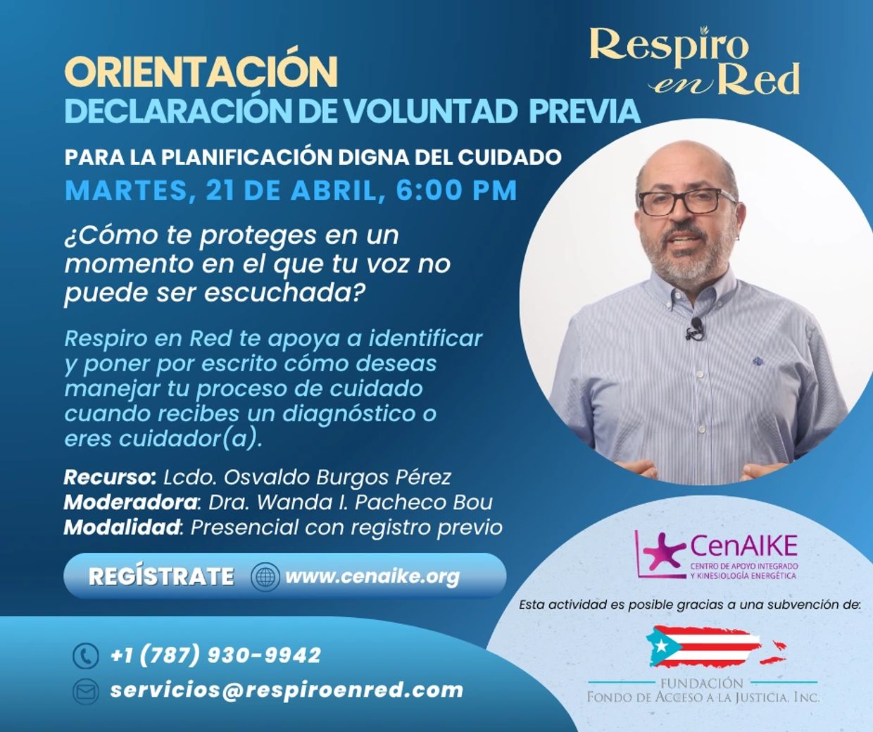 Acompáñanos este martes, 21 de abril, a una orientación grupal junto al Lcdo. Osvaldo Burgos Pérez sobre el desarrollo y el uso de las Declaraciones de Voluntad Previa en la planificación del cuidado.